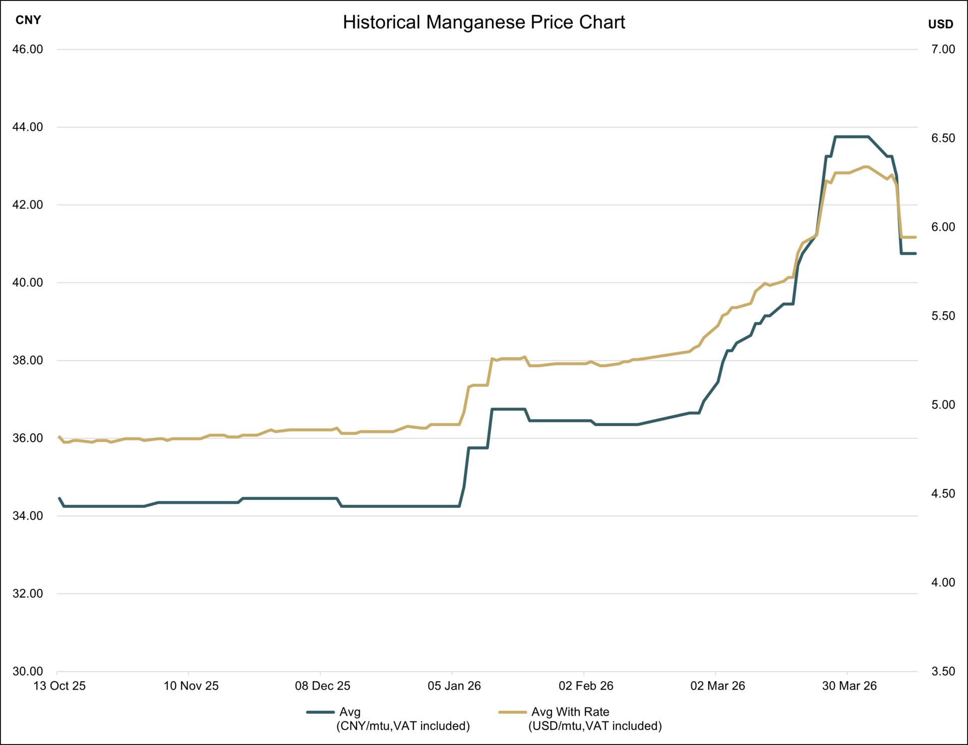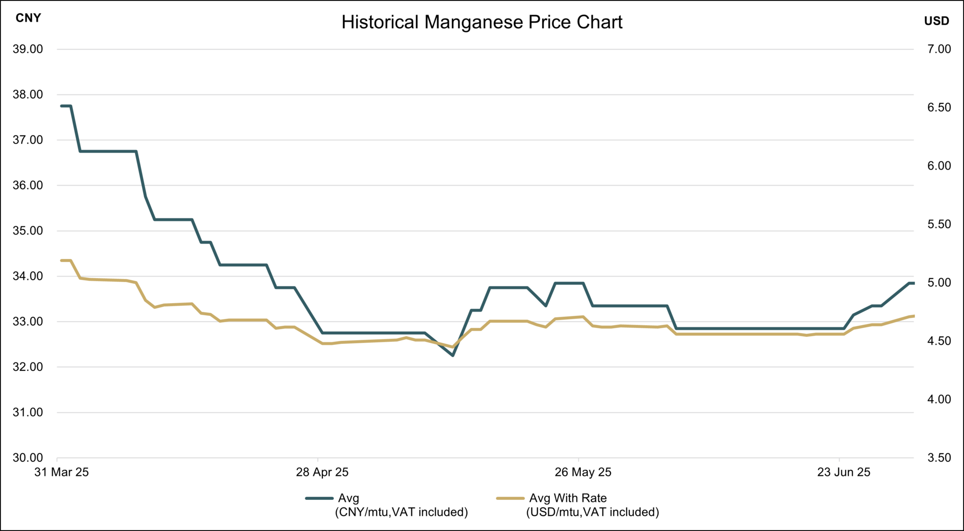 Disclaimer: The above price as published by Shanghai Metals Market reflects the traded price for manganese ore with a manganese content between 36-37% in Northern China. The majority of manganese ore imported into China is through Tianjin port. This price is therefore indicative of transaction prices achieved by traders who have material at Tianjin port. On the basis, it is a domestic sales price quoted in Chinese Yuan (“CNY”) it includes value added tax ("VAT") at 13%.