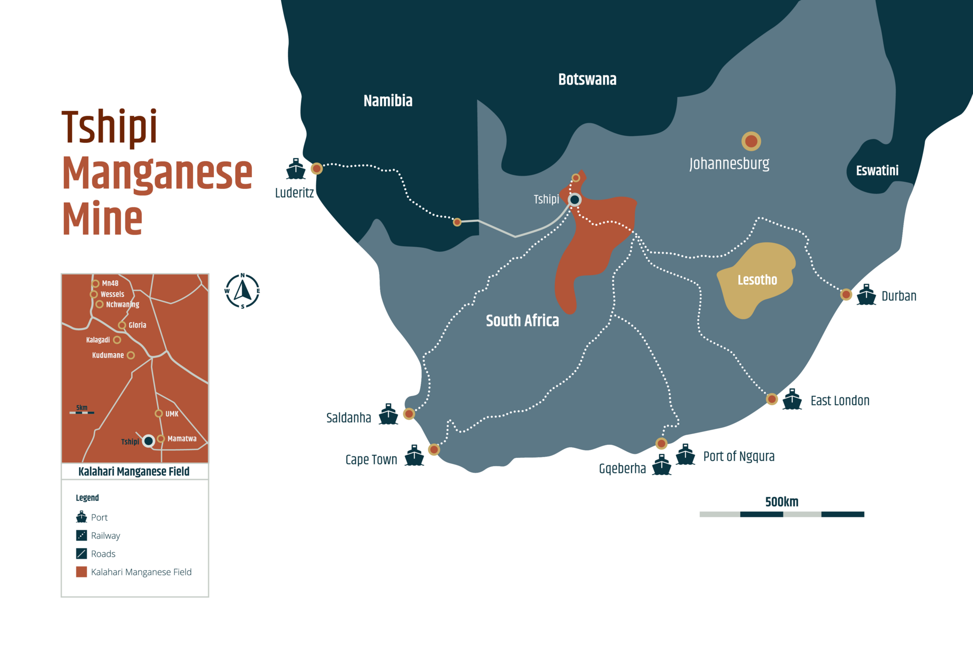 Tshipi operates as an open pit mine, producing on average 3.4 million tonnes of manganese ore annually, with the flexibility to scale production in line with market demand. This production capacity is supported by top-tier transport infrastructure, enabling rapid loading and efficient export processes. Tshipi's transport infrastructure is considered amongst the best in the entire Kalahari manganese field.